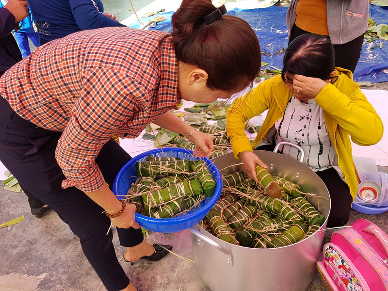 Ngay sau khi bánh được gói xong, hai nồi nước sôi lớn đã chờ sẵn để luộc bánh. Vào buổi chiều, khi gần 200 chiếc bánh Tét đã chín, học sinh, giáo viên và các cô chú dì cùng chia nhau bánh mang về thưởng thức cùng gia đình.