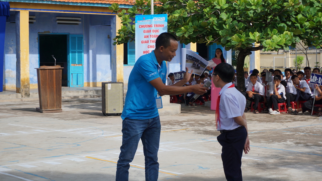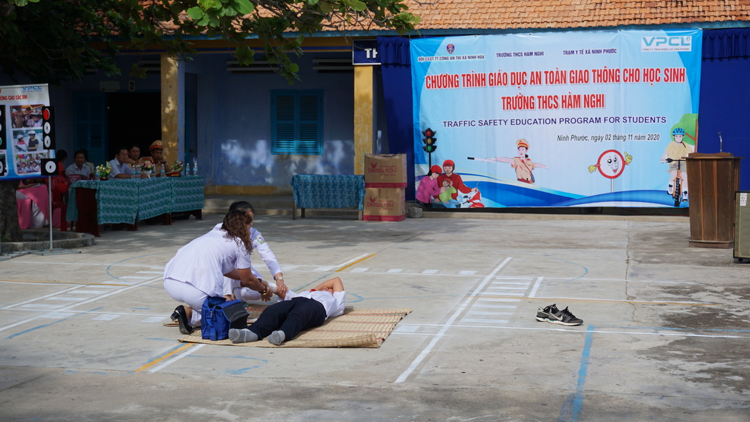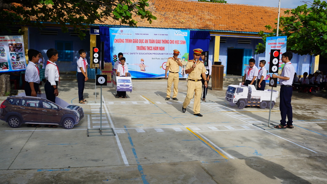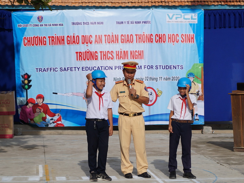 Các chú cảnh sát giao thông của thị xã Ninh Hòa đã đến trường để dạy các em về luật giao thông cũng như các quy định về đi bộ và lái xe đạp điện an toàn. Đặc biệt đối với việc tham gia giao thông xung quanh khu vực dự án, đại diện đội HSE của VPCL dành rất nhiều thời gian để căn dặn các em về những hành vi không an toàn khi di chuyển trên đường.